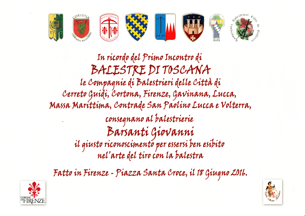 MartedĂŹ 23 Agosto 2016 si Ăš tenuta a Firenze presso la “Sala Barile” di Palazzo Panciatichi a Firenze, la premiazione del nostro balestriere Giovanni Barsanti, che ha ottenuto il miglior tiro con la balestra da banco durante la manifestazione Balestre di Toscana, che si era tenuta il 18 Giugno scorso in Piazza Santa Croce.