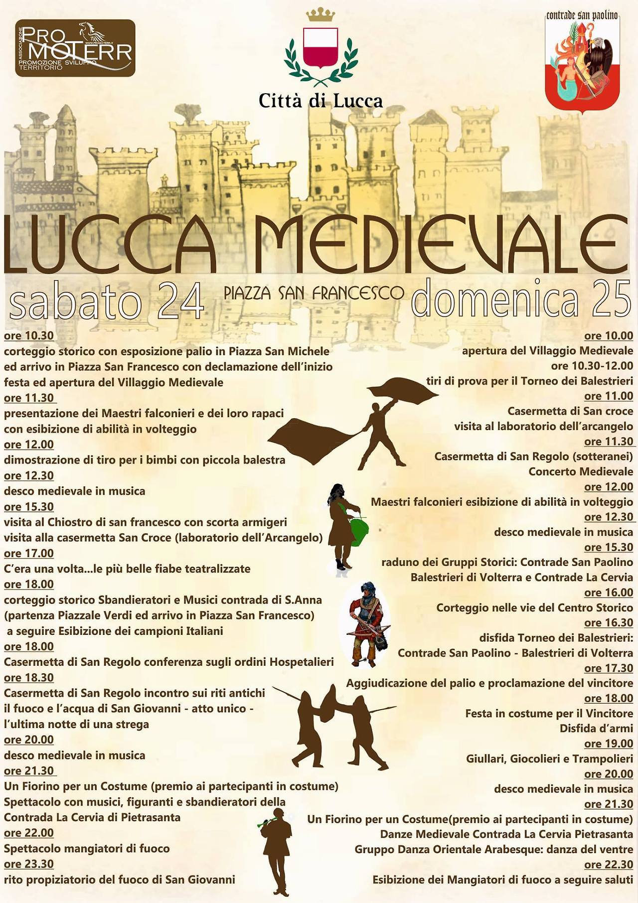 Anche quest’anno si rinnova l’appuntamento con Lucca Medievale, che trasformerà Piazza San Francesco per il weekend del 24 e 25 giugno in un antico accampamento medievale, con mercatino di arti e mestieri ormai quasi perduti, e con spettacoli durante tutto l’arco della giornata di falconieri, trampolieri, mangiafuoco, combattenti, musici, ma anche teatro e spettacoli per bambini.